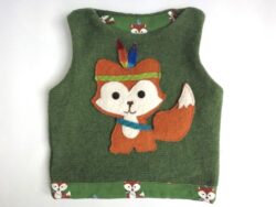 Fröhlicher kleiner Pullunder mit Fuchsmotiv 100% warme Lammwolle, hinterlegt mit frühlichem Fuchsjersey, kleiner warmer Überzieher für das ganze Jahr. Farbe: wie abgebildet Einzelstück wie beschrieben Gr. 74 / 80 sofort lieferbar Material: Außen: 100% Wolle (Upcycling) Innen: 100% Baumwolljersey 98% Baumwolle, 2% Elasthan